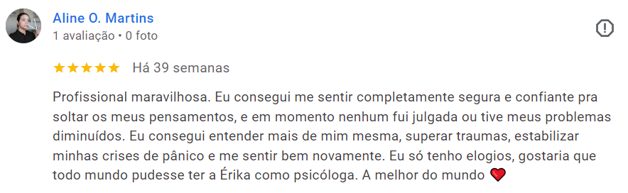 Leia relatos de pacientes que encontraram apoio e transformação em nosso atendimento especializado. Nota 5 na avaliação dos paciente no Google.